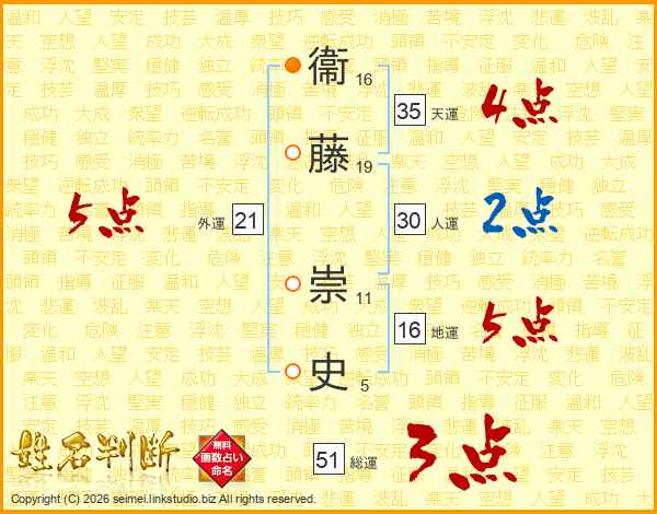 衞(16画)藤(19画) 崇(11画)史(5画)