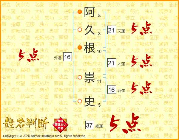 阿(8画)久(3画)根(10画) 崇(11画)史(5画)