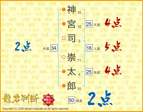 神(10画)宮(10画)司(5画) 崇(11画)太(4画)郎(10画)