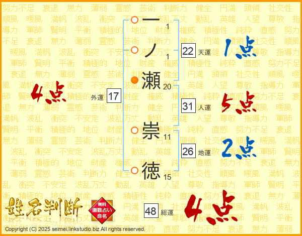 一(1画)ノ(1画)瀬(20画) 崇(11画)徳(15画)