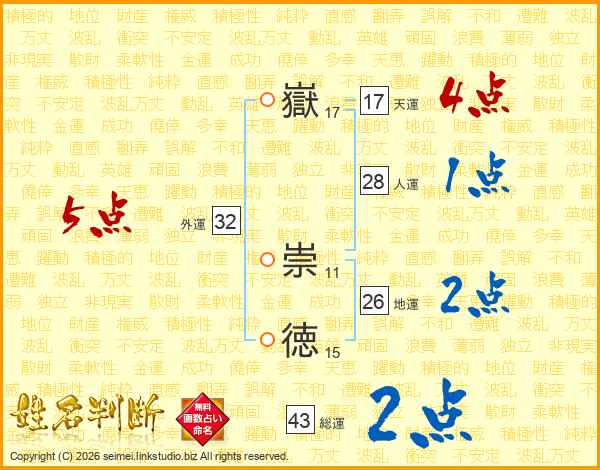 生活面を象徴する運勢です。外部から受ける影響力を表し、結婚運、家庭運や職場、環境への順応性を表します。総運から人運を引いた画数。姓や名が1文字の場合を除く。