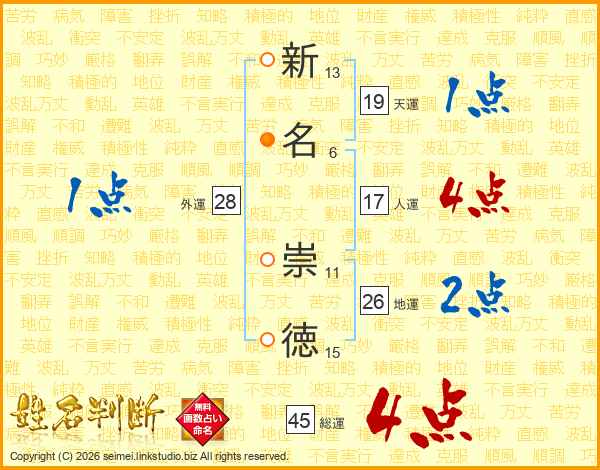 新名崇徳さんの総運は45画の4点!