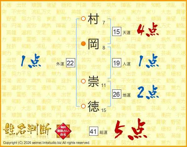 村岡崇徳さんの天運は15画の4点!