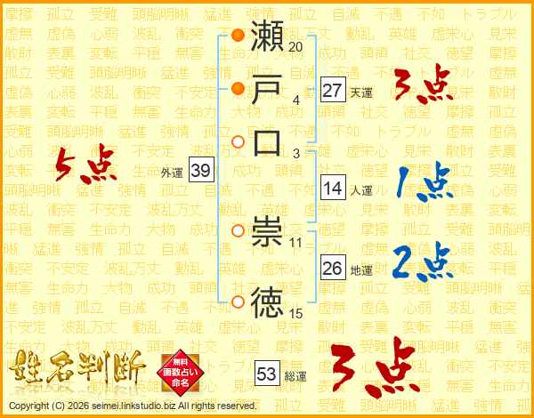 瀬(20画)戸(4画)口(3画) 崇(11画)徳(15画)