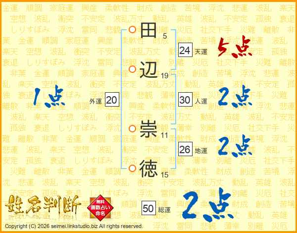 田(5画)辺(19画) 崇(11画)徳(15画)
