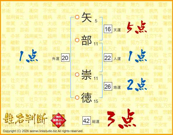 矢部崇徳さんの地運は26画の2点!
