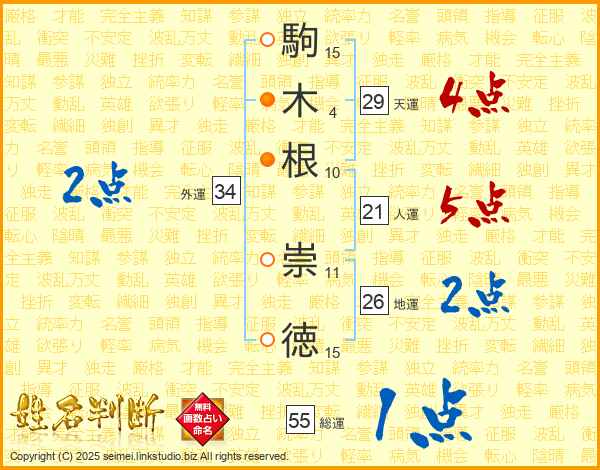 駒(15画)木(4画)根(10画) 崇(11画)徳(15画)