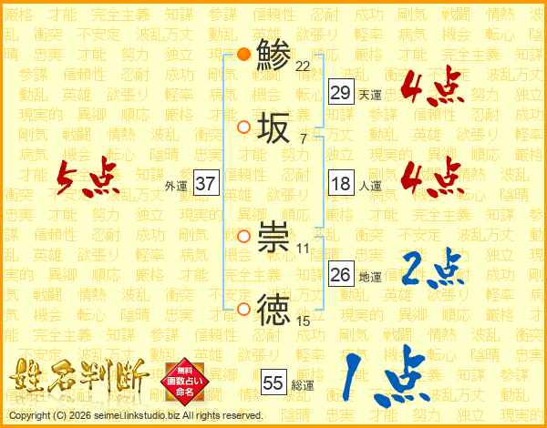 鯵(22画)坂(7画) 崇(11画)徳(15画)