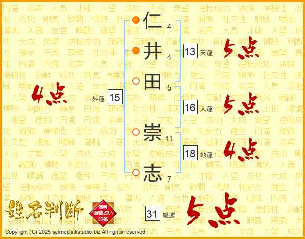 仁(4画)井(4画)田(5画) 崇(11画)志(7画)