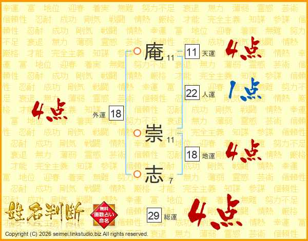 あなたの人生を表す1番重要な運勢です。生涯を通じて影響する総合運となり、主に50歳以降の晩年期に影響を及ぼします。苗字と名前の合計画数。