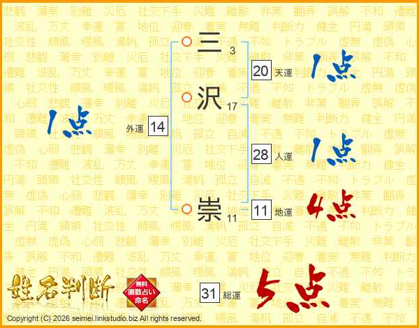 生活面を象徴する運勢です。外部から受ける影響力を表し、結婚運、家庭運や職場、環境への順応性を表します。総運から人運を引いた画数。姓や名が1文字の場合を除く。