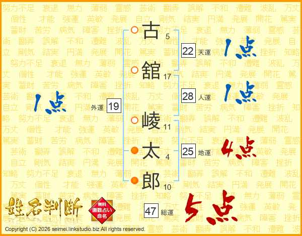 古(5画)舘(17画) 崚(11画)太(4画)郎(10画)