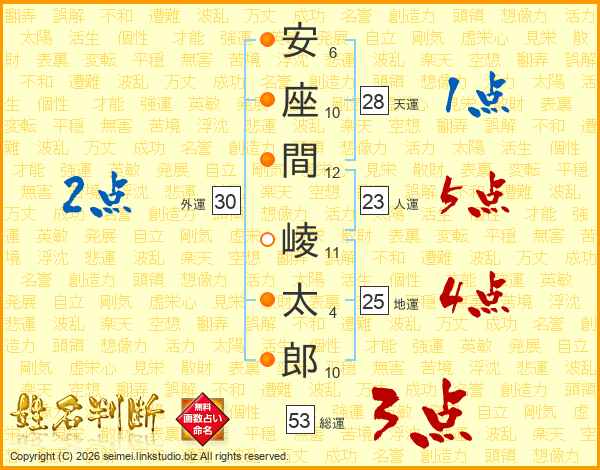 安(6画)座(10画)間(12画) 崚(11画)太(4画)郎(10画)
