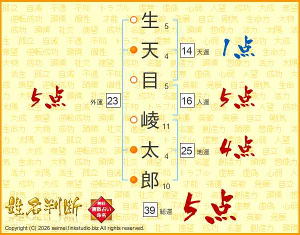 生(5画)天(4画)目(5画) 崚(11画)太(4画)郎(10画)