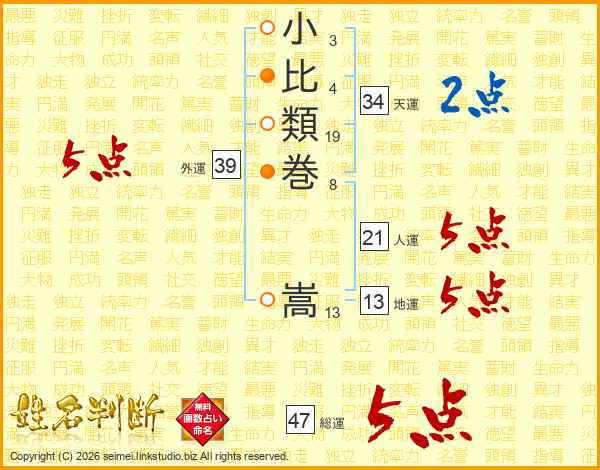 小比類巻嵩さんの外運は39画の5点!