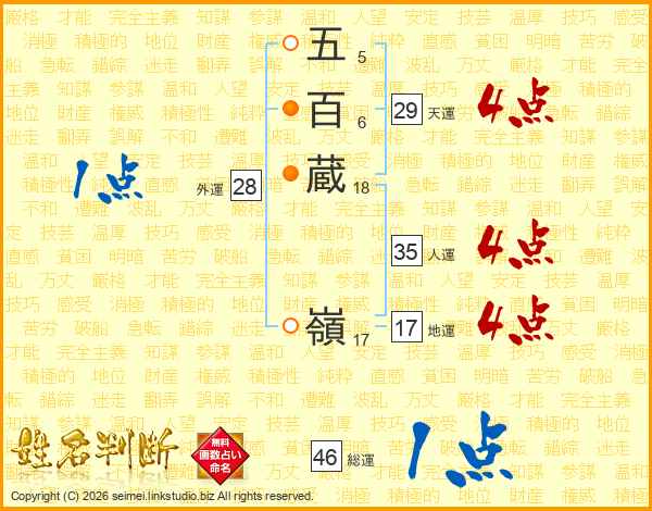 生活面を象徴する運勢です。外部から受ける影響力を表し、結婚運、家庭運や職場、環境への順応性を表します。総運から人運を引いた画数。姓や名が1文字の場合を除く。