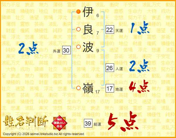 伊(6画)良(7画)波(9画) 嶺(17画)