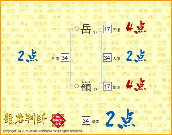 生活面を象徴する運勢です。外部から受ける影響力を表し、結婚運、家庭運や職場、環境への順応性を表します。総運から人運を引いた画数。姓や名が1文字の場合を除く。