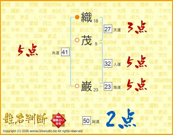 あなたの人生を表す1番重要な運勢です。生涯を通じて影響する総合運となり、主に50歳以降の晩年期に影響を及ぼします。苗字と名前の合計画数。