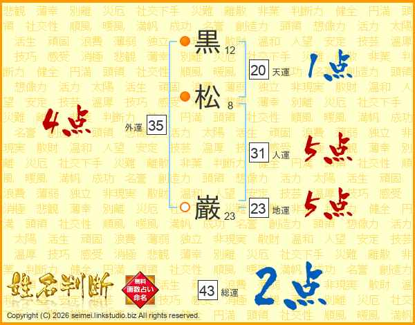 生活面を象徴する運勢です。外部から受ける影響力を表し、結婚運、家庭運や職場、環境への順応性を表します。総運から人運を引いた画数。姓や名が1文字の場合を除く。