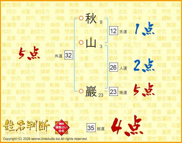 秋(9画)山(3画) 巖(23画)