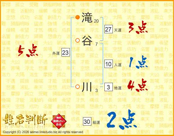 あなたの人生を表す1番重要な運勢です。生涯を通じて影響する総合運となり、主に50歳以降の晩年期に影響を及ぼします。苗字と名前の合計画数。