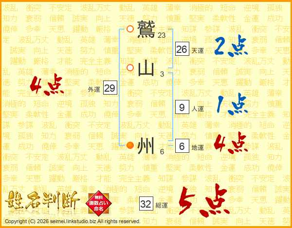 あなたの人生を表す1番重要な運勢です。生涯を通じて影響する総合運となり、主に50歳以降の晩年期に影響を及ぼします。苗字と名前の合計画数。