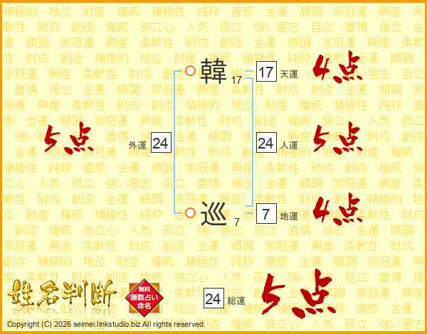 韓巡さんの総運は24画の5点!
