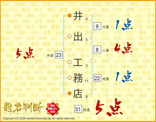 井(4画)出(5画) 工(3画)務(11画)店(8画)