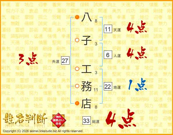 八子工務店さんの総運は33画の4点!