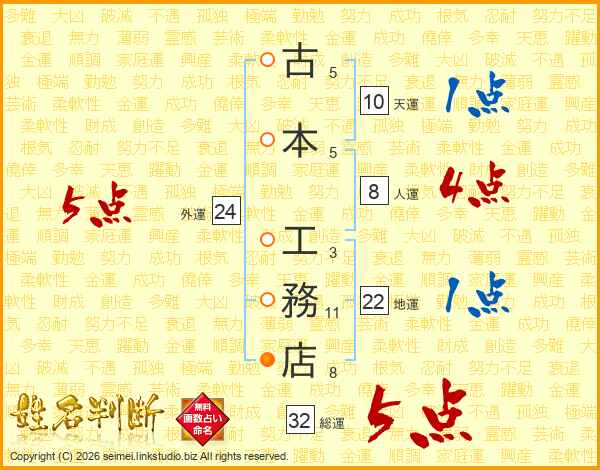 古(5画)本(5画) 工(3画)務(11画)店(8画)