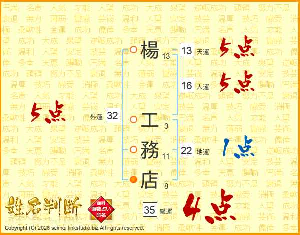 楊(13画) 工(3画)務(11画)店(8画)