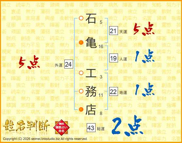 石亀工務店さんの天運は21画の5点!
