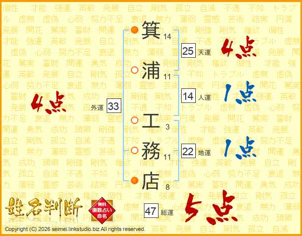 箕(14画)浦(11画) 工(3画)務(11画)店(8画)