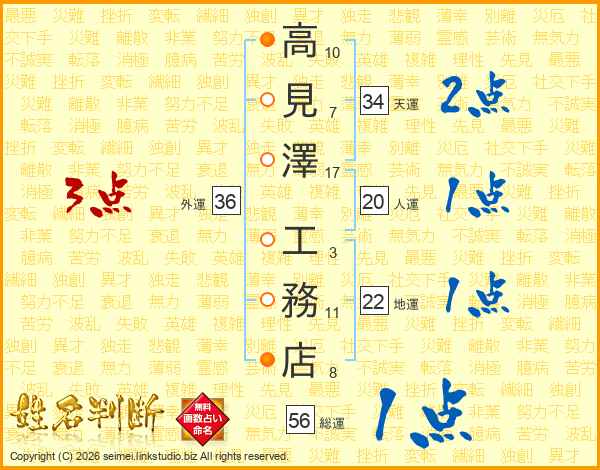 高(10画)見(7画)澤(17画) 工(3画)務(11画)店(8画)