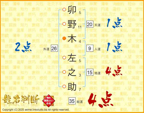 卯(5画)野(11画)木(4画) 左(5画)之(3画)助(7画)