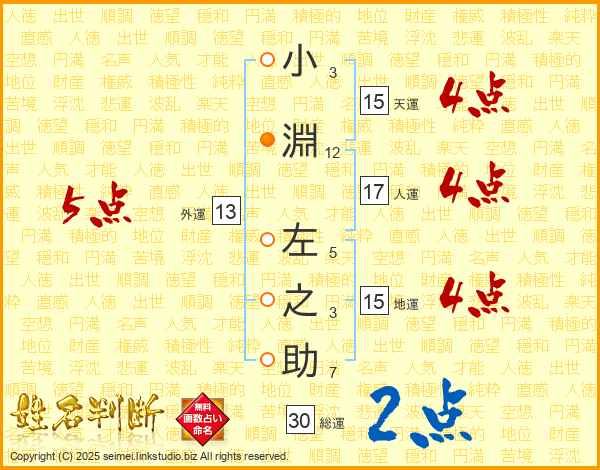 小(3画)淵(12画) 左(5画)之(3画)助(7画)
