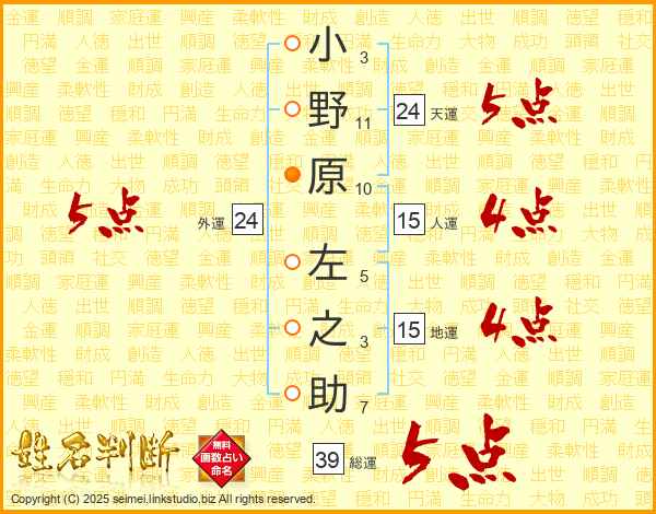 小(3画)野(11画)原(10画) 左(5画)之(3画)助(7画)