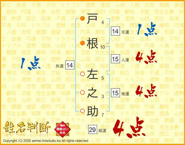 戸(4画)根(10画) 左(5画)之(3画)助(7画)
