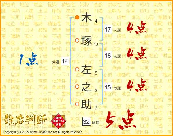 木(4画)塚(13画) 左(5画)之(3画)助(7画)