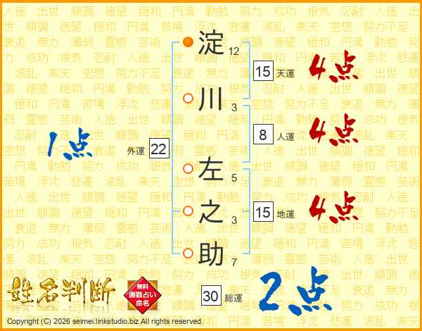 淀(12画)川(3画) 左(5画)之(3画)助(7画)