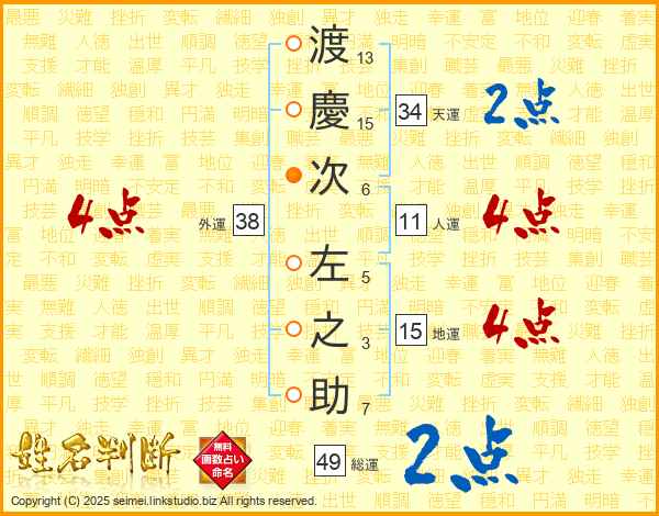 渡(13画)慶(15画)次(6画) 左(5画)之(3画)助(7画)