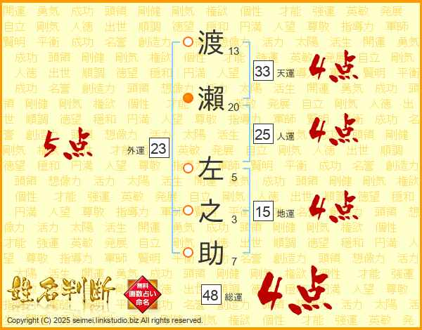渡(13画)瀨(20画) 左(5画)之(3画)助(7画)