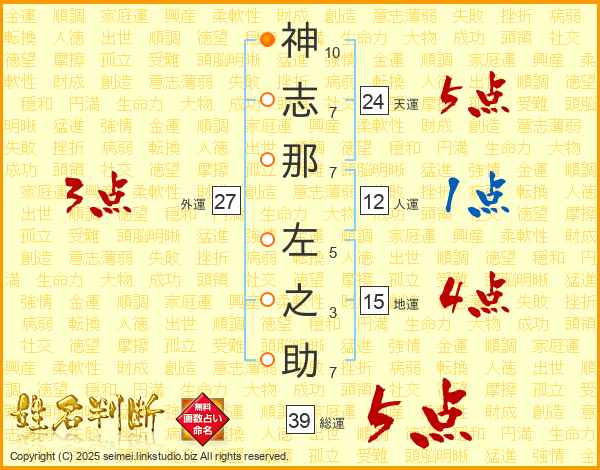 神志那左之助さんの総運は39画の5点!