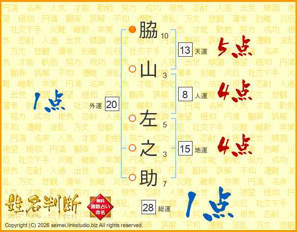 脇山左之助さんの天運は13画の5点!