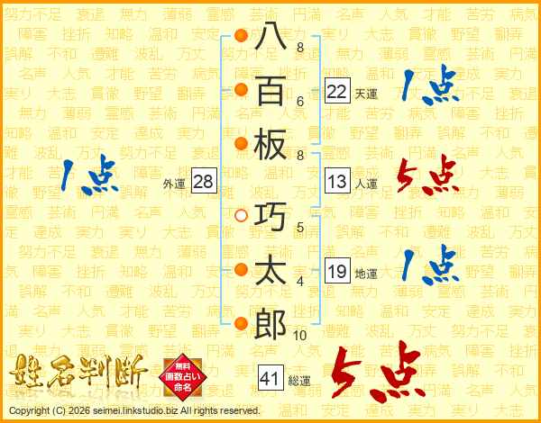 八(8画)百(6画)板(8画) 巧(5画)太(4画)郎(10画)