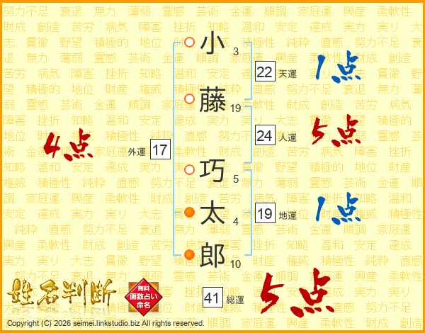 小(3画)藤(19画) 巧(5画)太(4画)郎(10画)