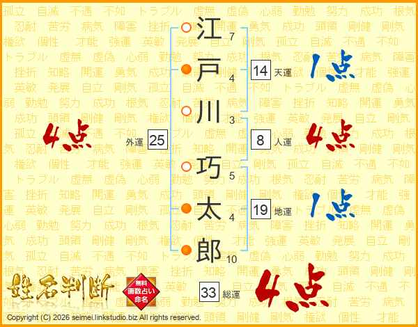 江(7画)戸(4画)川(3画) 巧(5画)太(4画)郎(10画)