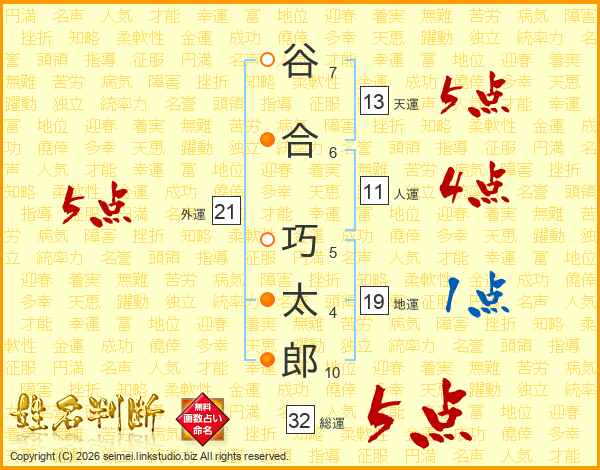 谷(7画)合(6画) 巧(5画)太(4画)郎(10画)