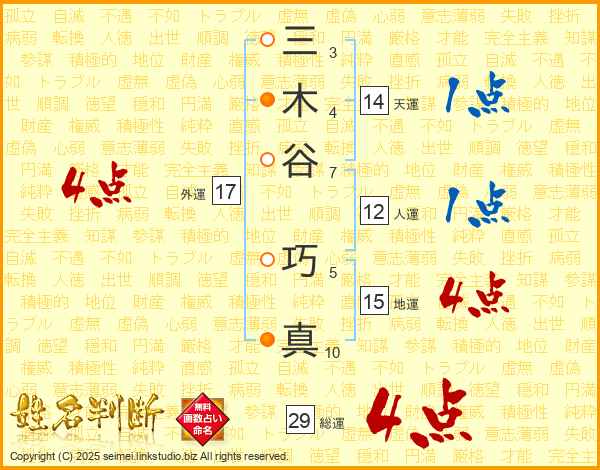 三(3画)木(4画)谷(7画) 巧(5画)真(10画)
